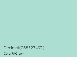 Decimal 288527497 Color is a light cyan color and the nearest color is Aqua Island #a1dad7. Hex code #acdfd1 and RGB value is rgb(172,223,209). In RGB color space, this color is composed of 67% red, 87% green, 82% blue, In CMYK color space, this color is composed of 23% cyan, 0% magenta, 6% yellow , 13% black , In HSL color space, this color has a hue angle of 164° , 44% saturation and 77% lightness.
