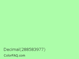 Decimal 288583977 Color is a very light green color and the nearest color is Mint Green #98ff98. Hex code #acfda9 and RGB value is rgb(172,253,169). In RGB color space, this color is composed of 67% red, 99% green, 66% blue, In CMYK color space, this color is composed of 32% cyan, 0% magenta, 33% yellow , 1% black , In HSL color space, this color has a hue angle of 118° , 95% saturation and 83% lightness.