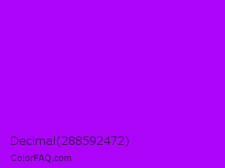 Decimal 288592472 Color is a normal purple color and the nearest color is Vivid Violet #9f00ff. Hex code #ad05fa and RGB value is rgb(173,5,250). In RGB color space, this color is composed of 68% red, 2% green, 98% blue, In CMYK color space, this color is composed of 31% cyan, 98% magenta, 0% yellow , 2% black , In HSL color space, this color has a hue angle of 281° , 96% saturation and 50% lightness.