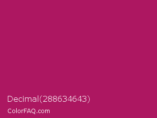 Decimal 288634643 Color is a normal rose color and the nearest color is Jazzberry Jam #a50b5e. Hex code #ad1761 and RGB value is rgb(173,23,97). In RGB color space, this color is composed of 68% red, 9% green, 38% blue, In CMYK color space, this color is composed of 0% cyan, 87% magenta, 44% yellow , 32% black , In HSL color space, this color has a hue angle of 330° , 77% saturation and 38% lightness.