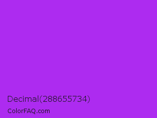 Decimal 288655734 Color is a normal purple color and the nearest color is Veronica #a020f0. Hex code #ad2bf0 and RGB value is rgb(173,43,240). In RGB color space, this color is composed of 68% red, 17% green, 94% blue, In CMYK color space, this color is composed of 28% cyan, 82% magenta, 0% yellow , 6% black , In HSL color space, this color has a hue angle of 280° , 87% saturation and 55% lightness.