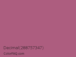 Decimal 288757347 Color is a normal rose color and the nearest color is Tapestry #b05e81. Hex code #ad5d7f and RGB value is rgb(173,93,127). In RGB color space, this color is composed of 68% red, 36% green, 50% blue, In CMYK color space, this color is composed of 0% cyan, 46% magenta, 27% yellow , 32% black , In HSL color space, this color has a hue angle of 335° , 33% saturation and 52% lightness.