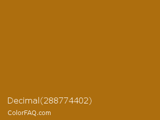 Decimal 288774402 Color is a normal orange color and the nearest color is Mai Tai #b06608. Hex code #ad6e0e and RGB value is rgb(173,110,14). In RGB color space, this color is composed of 68% red, 43% green, 5% blue, In CMYK color space, this color is composed of 0% cyan, 36% magenta, 92% yellow , 32% black , In HSL color space, this color has a hue angle of 36° , 85% saturation and 37% lightness.