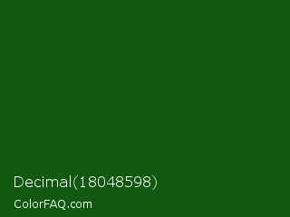 Decimal 18048598 Color is a very dark green color and the nearest color is Parsley #134f19. Hex code #115810 and RGB value is rgb(17,88,16). In RGB color space, this color is composed of 7% red, 35% green, 6% blue, In CMYK color space, this color is composed of 81% cyan, 0% magenta, 82% yellow , 65% black , In HSL color space, this color has a hue angle of 119° , 69% saturation and 20% lightness.