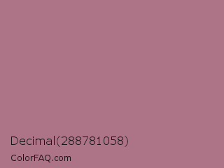 Decimal 288781058 Color is a normal rose color and the nearest color is Turkish Rose #b57281. Hex code #ad7386 and RGB value is rgb(173,115,134). In RGB color space, this color is composed of 68% red, 45% green, 53% blue, In CMYK color space, this color is composed of 0% cyan, 34% magenta, 23% yellow , 32% black , In HSL color space, this color has a hue angle of 340° , 26% saturation and 56% lightness.