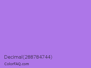 Decimal 288784744 Color is a light violet color and the nearest color is Lavender #b57edc. Hex code #ad76e8 and RGB value is rgb(173,118,232). In RGB color space, this color is composed of 68% red, 46% green, 91% blue, In CMYK color space, this color is composed of 25% cyan, 49% magenta, 0% yellow , 9% black , In HSL color space, this color has a hue angle of 269° , 71% saturation and 69% lightness.