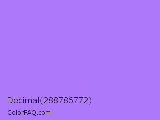 Decimal 288786772 Color is a light violet color and the nearest color is Lavender #b57edc. Hex code #ad79fa and RGB value is rgb(173,121,250). In RGB color space, this color is composed of 68% red, 47% green, 98% blue, In CMYK color space, this color is composed of 31% cyan, 52% magenta, 0% yellow , 2% black , In HSL color space, this color has a hue angle of 264° , 93% saturation and 73% lightness.