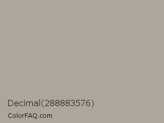 Decimal 288883576 Color is a light orange color and the nearest color is Cloudy #aca59f. Hex code #ada69a and RGB value is rgb(173,166,154). In RGB color space, this color is composed of 68% red, 65% green, 60% blue, In CMYK color space, this color is composed of 0% cyan, 4% magenta, 11% yellow , 32% black , In HSL color space, this color has a hue angle of 38° , 10% saturation and 64% lightness.