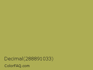 Decimal 288891033 Color is a normal yellow color and the nearest color is Olive Green #b5b35c. Hex code #adad53 and RGB value is rgb(173,173,83). In RGB color space, this color is composed of 68% red, 68% green, 33% blue, In CMYK color space, this color is composed of 0% cyan, 0% magenta, 52% yellow , 32% black , In HSL color space, this color has a hue angle of 60° , 35% saturation and 50% lightness.