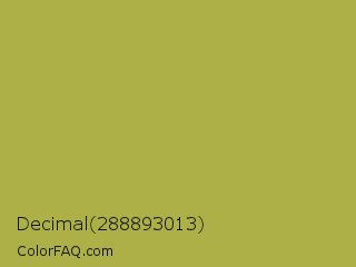 Decimal 288893013 Color is a normal yellow color and the nearest color is Brass #b5a642. Hex code #adb047 and RGB value is rgb(173,176,71). In RGB color space, this color is composed of 68% red, 69% green, 28% blue, In CMYK color space, this color is composed of 2% cyan, 0% magenta, 60% yellow , 31% black , In HSL color space, this color has a hue angle of 62° , 43% saturation and 48% lightness.