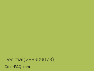 Decimal 288909073 Color is a normal yellow color and the nearest color is Middle Green Yellow #acbf60. Hex code #adbf57 and RGB value is rgb(173,191,87). In RGB color space, this color is composed of 68% red, 75% green, 34% blue, In CMYK color space, this color is composed of 9% cyan, 0% magenta, 54% yellow , 25% black , In HSL color space, this color has a hue angle of 70° , 45% saturation and 55% lightness.