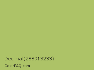 Decimal 288913233 Color is a normal lime color and the nearest color is Middle Green Yellow #acbf60. Hex code #adc367 and RGB value is rgb(173,195,103). In RGB color space, this color is composed of 68% red, 76% green, 40% blue, In CMYK color space, this color is composed of 11% cyan, 0% magenta, 47% yellow , 24% black , In HSL color space, this color has a hue angle of 74° , 43% saturation and 58% lightness.