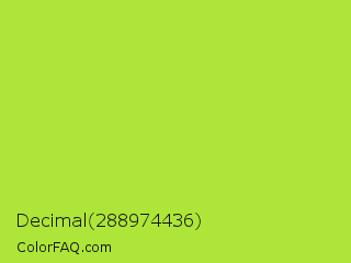 Decimal 288974436 Color is a normal green color and the nearest color is Green Lizard #a7f432. Hex code #ade638 and RGB value is rgb(173,230,56). In RGB color space, this color is composed of 68% red, 90% green, 22% blue, In CMYK color space, this color is composed of 25% cyan, 0% magenta, 76% yellow , 10% black , In HSL color space, this color has a hue angle of 80° , 78% saturation and 56% lightness.