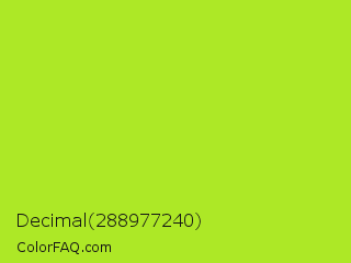 Decimal 288977240 Color is a normal lime color and the nearest color is Green Lizard #a7f432. Hex code #ade826 and RGB value is rgb(173,232,38). In RGB color space, this color is composed of 68% red, 91% green, 15% blue, In CMYK color space, this color is composed of 25% cyan, 0% magenta, 84% yellow , 9% black , In HSL color space, this color has a hue angle of 78° , 81% saturation and 53% lightness.