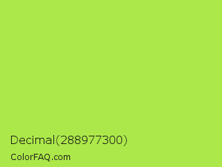 Decimal 288977300 Color is a normal green color and the nearest color is Conifer #acdd4d. Hex code #ade84a and RGB value is rgb(173,232,74). In RGB color space, this color is composed of 68% red, 91% green, 29% blue, In CMYK color space, this color is composed of 25% cyan, 0% magenta, 68% yellow , 9% black , In HSL color space, this color has a hue angle of 82° , 77% saturation and 60% lightness.