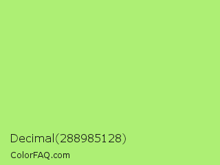 Decimal 288985128 Color is a light green color and the nearest color is Sulu #c1f07c. Hex code #adef74 and RGB value is rgb(173,239,116). In RGB color space, this color is composed of 68% red, 94% green, 45% blue, In CMYK color space, this color is composed of 28% cyan, 0% magenta, 51% yellow , 6% black , In HSL color space, this color has a hue angle of 92° , 79% saturation and 70% lightness.