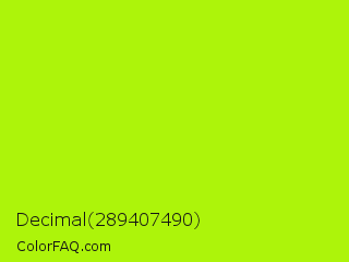 Decimal 289407490 Color is a normal lime color and the nearest color is Spring Bud #a7fc00. Hex code #adf40a and RGB value is rgb(173,244,10). In RGB color space, this color is composed of 68% red, 96% green, 4% blue, In CMYK color space, this color is composed of 29% cyan, 0% magenta, 96% yellow , 4% black , In HSL color space, this color has a hue angle of 78° , 92% saturation and 50% lightness.