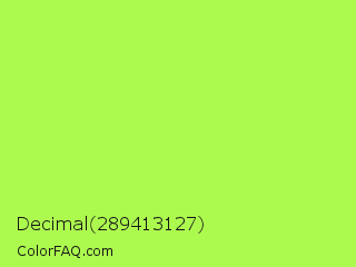 Decimal 289413127 Color is a light green color and the nearest color is Inchworm #b2ec5d. Hex code #adfa4f and RGB value is rgb(173,250,79). In RGB color space, this color is composed of 68% red, 98% green, 31% blue, In CMYK color space, this color is composed of 31% cyan, 0% magenta, 68% yellow , 2% black , In HSL color space, this color has a hue angle of 87° , 94% saturation and 65% lightness.
