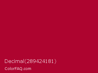 Decimal 289424181 Color is a normal red color and the nearest color is Alabama Crimson #af002a. Hex code #ae042f and RGB value is rgb(174,4,47). In RGB color space, this color is composed of 68% red, 2% green, 18% blue, In CMYK color space, this color is composed of 0% cyan, 98% magenta, 73% yellow , 32% black , In HSL color space, this color has a hue angle of 345° , 96% saturation and 35% lightness.