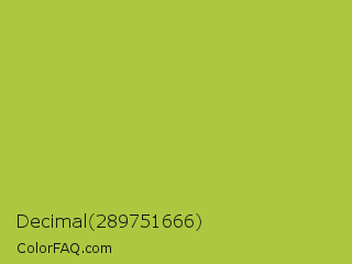 Decimal 289751666 Color is a normal lime color and the nearest color is Android Green #a4c639. Hex code #aec740 and RGB value is rgb(174,199,64). In RGB color space, this color is composed of 68% red, 78% green, 25% blue, In CMYK color space, this color is composed of 13% cyan, 0% magenta, 68% yellow , 22% black , In HSL color space, this color has a hue angle of 71° , 55% saturation and 52% lightness.