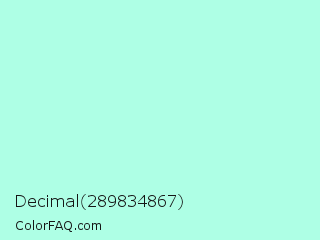 Decimal 289834867 Color is a very light green color and the nearest color is Ice Cold #b1f4e7. Hex code #aeffe5 and RGB value is rgb(174,255,229). In RGB color space, this color is composed of 68% red, 100% green, 90% blue, In CMYK color space, this color is composed of 32% cyan, 0% magenta, 10% yellow , 0% black , In HSL color space, this color has a hue angle of 161° , 100% saturation and 84% lightness.
