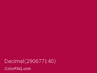 Decimal 290677140 Color is a normal rose color and the nearest color is Shiraz #b20931. Hex code #b00742 and RGB value is rgb(176,7,66). In RGB color space, this color is composed of 69% red, 3% green, 26% blue, In CMYK color space, this color is composed of 0% cyan, 96% magenta, 63% yellow , 31% black , In HSL color space, this color has a hue angle of 339° , 92% saturation and 36% lightness.