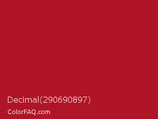 Decimal 290690897 Color is a normal red color and the nearest color is Upsdell Red #ae2029. Hex code #b01527 and RGB value is rgb(176,21,39). In RGB color space, this color is composed of 69% red, 8% green, 15% blue, In CMYK color space, this color is composed of 0% cyan, 88% magenta, 78% yellow , 31% black , In HSL color space, this color has a hue angle of 353° , 79% saturation and 39% lightness.