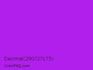 Decimal 290727175 Color is a normal purple color and the nearest color is Veronica #a020f0. Hex code #b01feb and RGB value is rgb(176,31,235). In RGB color space, this color is composed of 69% red, 12% green, 92% blue, In CMYK color space, this color is composed of 25% cyan, 87% magenta, 0% yellow , 8% black , In HSL color space, this color has a hue angle of 283° , 84% saturation and 52% lightness.