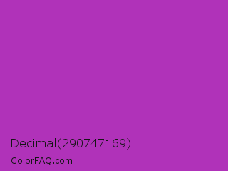 Decimal 290747169 Color is a normal magenta color and the nearest color is Byzantine #bd33a4. Hex code #b032b9 and RGB value is rgb(176,50,185). In RGB color space, this color is composed of 69% red, 20% green, 73% blue, In CMYK color space, this color is composed of 5% cyan, 73% magenta, 0% yellow , 27% black , In HSL color space, this color has a hue angle of 296° , 57% saturation and 46% lightness.