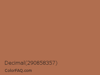 Decimal 290858357 Color is a normal orange color and the nearest color is Brown Sugar #af6e4d. Hex code #b06e4f and RGB value is rgb(176,110,79). In RGB color space, this color is composed of 69% red, 43% green, 31% blue, In CMYK color space, this color is composed of 0% cyan, 38% magenta, 55% yellow , 31% black , In HSL color space, this color has a hue angle of 19° , 38% saturation and 50% lightness.