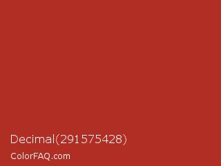 Decimal 291575428 Color is a normal red color and the nearest color is Tall Poppy #b32d29. Hex code #b12e24 and RGB value is rgb(177,46,36). In RGB color space, this color is composed of 69% red, 18% green, 14% blue, In CMYK color space, this color is composed of 0% cyan, 74% magenta, 80% yellow , 31% black , In HSL color space, this color has a hue angle of 4° , 66% saturation and 42% lightness.