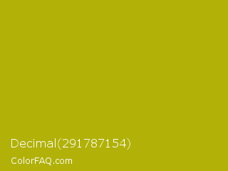 Decimal 291787154 Color is a normal yellow color and the nearest color is La Rioja #b3c110. Hex code #b1b108 and RGB value is rgb(177,177,8). In RGB color space, this color is composed of 69% red, 69% green, 3% blue, In CMYK color space, this color is composed of 0% cyan, 0% magenta, 95% yellow , 31% black , In HSL color space, this color has a hue angle of 60° , 91% saturation and 36% lightness.