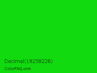 Decimal 18258228 Color is a normal green color and the nearest color is Vivid Malachite #00cc33. Hex code #11da0e and RGB value is rgb(17,218,14). In RGB color space, this color is composed of 7% red, 85% green, 5% blue, In CMYK color space, this color is composed of 92% cyan, 0% magenta, 94% yellow , 15% black , In HSL color space, this color has a hue angle of 119° , 88% saturation and 45% lightness.