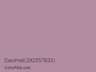 Decimal 292557833 Color is a light magenta color and the nearest color is Opera Mauve #b784a7. Hex code #b28ca1 and RGB value is rgb(178,140,161). In RGB color space, this color is composed of 70% red, 55% green, 63% blue, In CMYK color space, this color is composed of 0% cyan, 21% magenta, 10% yellow , 30% black , In HSL color space, this color has a hue angle of 327° , 20% saturation and 62% lightness.