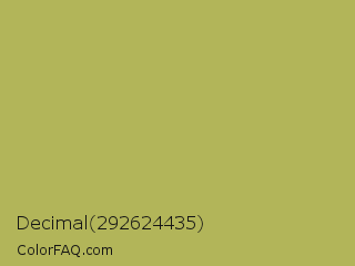 Decimal 292624435 Color is a normal yellow color and the nearest color is Olive Green #b5b35c. Hex code #b2b559 and RGB value is rgb(178,181,89). In RGB color space, this color is composed of 70% red, 71% green, 35% blue, In CMYK color space, this color is composed of 2% cyan, 0% magenta, 51% yellow , 29% black , In HSL color space, this color has a hue angle of 62° , 38% saturation and 53% lightness.