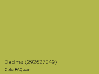 Decimal 292627249 Color is a normal yellow color and the nearest color is Olive Green #b5b35c. Hex code #b2b74b and RGB value is rgb(178,183,75). In RGB color space, this color is composed of 70% red, 72% green, 29% blue, In CMYK color space, this color is composed of 3% cyan, 0% magenta, 59% yellow , 28% black , In HSL color space, this color has a hue angle of 63° , 43% saturation and 51% lightness.