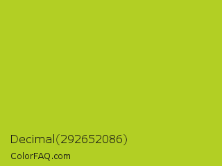 Decimal 292652086 Color is a normal yellow color and the nearest color is Key Lime Pie #bfc921. Hex code #b2cf24 and RGB value is rgb(178,207,36). In RGB color space, this color is composed of 70% red, 81% green, 14% blue, In CMYK color space, this color is composed of 14% cyan, 0% magenta, 83% yellow , 19% black , In HSL color space, this color has a hue angle of 70° , 70% saturation and 48% lightness.