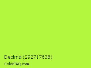 Decimal 292717638 Color is a normal green color and the nearest color is Green Lizard #a7f432. Hex code #b2f63e and RGB value is rgb(178,246,62). In RGB color space, this color is composed of 70% red, 96% green, 24% blue, In CMYK color space, this color is composed of 28% cyan, 0% magenta, 75% yellow , 4% black , In HSL color space, this color has a hue angle of 82° , 91% saturation and 60% lightness.