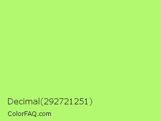 Decimal 292721251 Color is a light green color and the nearest color is Sulu #c1f07c. Hex code #b2f96f and RGB value is rgb(178,249,111). In RGB color space, this color is composed of 70% red, 98% green, 44% blue, In CMYK color space, this color is composed of 29% cyan, 0% magenta, 55% yellow , 2% black , In HSL color space, this color has a hue angle of 91° , 92% saturation and 71% lightness.
