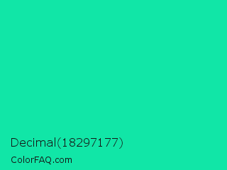 Decimal 18297177 Color is a normal green color and the nearest color is Medium Spring Green #00fa9a. Hex code #11e6a7 and RGB value is rgb(17,230,167). In RGB color space, this color is composed of 7% red, 90% green, 65% blue, In CMYK color space, this color is composed of 93% cyan, 0% magenta, 27% yellow , 10% black , In HSL color space, this color has a hue angle of 162° , 86% saturation and 48% lightness.
