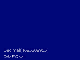 Decimal 4685308965 Color is a dark blue color and the nearest color is Navy Blue #000080. Hex code #000779 and RGB value is rgb(0,7,121). In RGB color space, this color is composed of 0% red, 3% green, 47% blue, In CMYK color space, this color is composed of 100% cyan, 94% magenta, 0% yellow , 53% black , In HSL color space, this color has a hue angle of 237° , 100% saturation and 24% lightness.