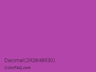Decimal 292848930 Color is a normal magenta color and the nearest color is Byzantine #bd33a4. Hex code #b344aa and RGB value is rgb(179,68,170). In RGB color space, this color is composed of 70% red, 27% green, 67% blue, In CMYK color space, this color is composed of 0% cyan, 62% magenta, 5% yellow , 30% black , In HSL color space, this color has a hue angle of 305° , 45% saturation and 48% lightness.