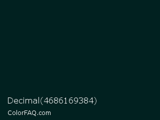 Decimal 4686169384 Color is a almost black cyan color and the nearest color is Swamp #001b1c. Hex code #012120 and RGB value is rgb(1,33,32). In RGB color space, this color is composed of 0% red, 13% green, 13% blue, In CMYK color space, this color is composed of 97% cyan, 0% magenta, 3% yellow , 87% black , In HSL color space, this color has a hue angle of 178° , 94% saturation and 7% lightness.