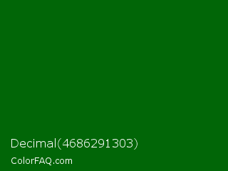 Decimal 4686291303 Color is a very dark green color and the nearest color is Deep Green #056608. Hex code #016607 and RGB value is rgb(1,102,7). In RGB color space, this color is composed of 0% red, 40% green, 3% blue, In CMYK color space, this color is composed of 99% cyan, 0% magenta, 93% yellow , 60% black , In HSL color space, this color has a hue angle of 124° , 98% saturation and 20% lightness.