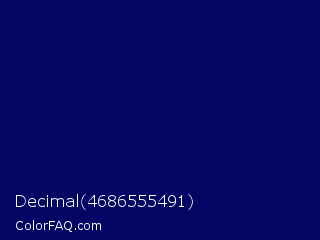 Decimal 4686555491 Color is a very dark blue color and the nearest color is Arapawa #110c6c. Hex code #020563 and RGB value is rgb(2,5,99). In RGB color space, this color is composed of 1% red, 2% green, 39% blue, In CMYK color space, this color is composed of 98% cyan, 95% magenta, 0% yellow , 61% black , In HSL color space, this color has a hue angle of 238° , 96% saturation and 20% lightness.