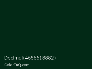 Decimal 4686618882 Color is a almost black green color and the nearest color is English Holly #022d15. Hex code #022916 and RGB value is rgb(2,41,22). In RGB color space, this color is composed of 1% red, 16% green, 9% blue, In CMYK color space, this color is composed of 95% cyan, 0% magenta, 46% yellow , 84% black , In HSL color space, this color has a hue angle of 151° , 91% saturation and 8% lightness.