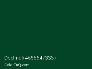 Decimal 4686647335 Color is a very dark green color and the nearest color is Forest Green #014421. Hex code #024423 and RGB value is rgb(2,68,35). In RGB color space, this color is composed of 1% red, 27% green, 14% blue, In CMYK color space, this color is composed of 97% cyan, 0% magenta, 49% yellow , 73% black , In HSL color space, this color has a hue angle of 150° , 94% saturation and 14% lightness.