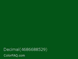 Decimal 4686688529 Color is a very dark green color and the nearest color is Camarone #00581a. Hex code #025417 and RGB value is rgb(2,84,23). In RGB color space, this color is composed of 1% red, 33% green, 9% blue, In CMYK color space, this color is composed of 98% cyan, 0% magenta, 73% yellow , 67% black , In HSL color space, this color has a hue angle of 135° , 95% saturation and 17% lightness.