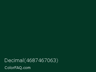 Decimal 4687467063 Color is a very dark green color and the nearest color is Bottle Green #093624. Hex code #033725 and RGB value is rgb(3,55,37). In RGB color space, this color is composed of 1% red, 22% green, 15% blue, In CMYK color space, this color is composed of 95% cyan, 0% magenta, 33% yellow , 78% black , In HSL color space, this color has a hue angle of 159° , 90% saturation and 11% lightness.