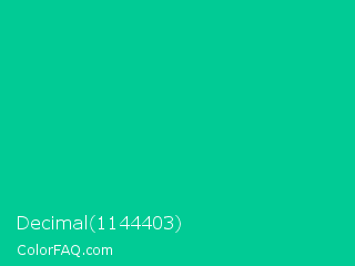 Decimal 1144403 Color is a normal cyan color and the nearest color is Caribbean Green #00cc99. Hex code #01cb95 and RGB value is rgb(1,203,149). In RGB color space, this color is composed of 0% red, 80% green, 58% blue, In CMYK color space, this color is composed of 100% cyan, 0% magenta, 27% yellow , 20% black , In HSL color space, this color has a hue angle of 164° , 99% saturation and 40% lightness.